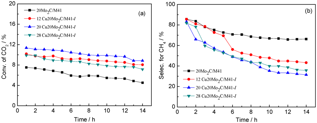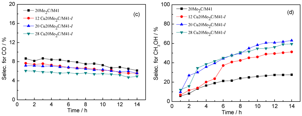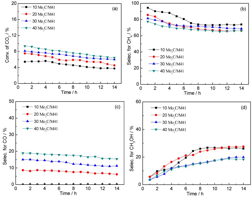 The catalytic performances of the yMo2C/M41 samples were studied for the hydrogenation of CO2 at 493 K under a pressure of 3.0 MPa and GHSV of 3600 mL/(h·g), and the results are shown in Figure 5. The conversion of CO2 increased from ~6% to ~8% as the Mo2C loading increased from 10% to 40%, which was due to a higher density of active sites on the catalyst surface. In this process, H2 was activated by the forming C–H between the surface of Mo2C and the adsorbed H2 [41]; at the same time, CO2 was activated by the forming a C–C bond between the surface of Mo2C and the adsorbed CO2 by a net carbide→CO2 charge transfer [33]. As the Mo2C loading increased, a decrease in the selectivity of CH4 was observed. However, the selectivity to CO increased. When the loading of Mo2C was 10% and 20%, the selectivity for CH3OH was higher, and a selectivity of 28% for CH3OH was observed over the 20Mo2C/M41 catalyst when the reaction was carried out for 14 h. However, the selectivity for CH3OH decreased when the Mo2C loading exceeded 30%, and more CO was produced. During the hydrogenation of CO2, CO and CH3OH were produced by two competitive pathways. The HOCO intermediate was formed firstly on the Mo2C surface. The cleavage of one C–O bond of the HOCO intermediate results in its decomposition to CO. However, the HOCO intermediate can transform into the HCOO intermediate, which can undergo stepwise hydrogenation to CH3OH [34,42]. Therefore, based on the effect of the Mo2C loading amount on CO2 conversion and CH3OH selectivity, the optimal Mo2C loading was 20%.