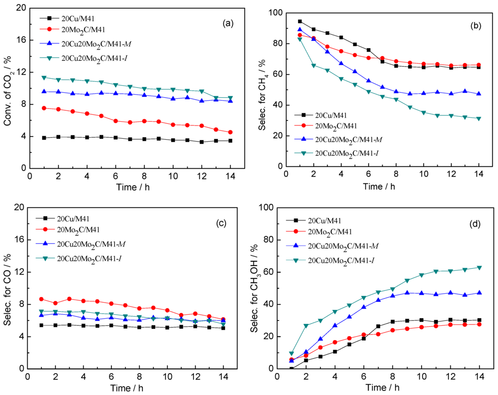 Catalytic performance of 20Cu20Mo2C/M41-I in CO2 hydrogenation. (a) CO2 conversion; (b) CH4 selectivity; (c) CO selectivity; (d) CH3OH selectivity. Reaction conditions: catalyst 0.5 g, temperature 493 K, pressure 3.0 MPa (H2:CO2 = 3:1), GHSV 3600 mL/(h·g).