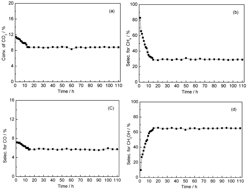 The performances of the catalysts for CO2 hydrogenation were investigated under pressurized conditions with a high-pressure fixed bed reactor system. A 0.5-g portion of the catalyst was placed in the reactor along with inert quartz sands above and below the catalyst. All the catalysts were reduced in a flow of hydrogen at 673 K for 1 h prior to the reaction. When the temperature was cooled from 673 K to 493 K, the feed gas (i.e. CO2/H2/Ar (H2:CO2 volume ratio was 3:1)) flowed into the system at a pressure of 3.0 MPa and GHSV of 3600 mL/(h·g). All the products were produced in the gaseous state and analyzed using a gas chromatograph (GC). Ar, CO and CO2 were analyzed using a GC equipped with a thermal conductivity detector (TCD) and a column consisting of activated charcoal. CH4 and CH3OH were analyzed using another GC equipped with a flame ionization detector (FID). Ar was used as the internal standard for the GC/TCD analyses. It was important to note that only trace amounts of C2H6, C3H8, and CH3OCH3 were detected in the products, and their content was ignored.