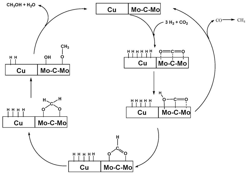 Proposed reaction mechanism for CO2 hydrogenation over Cu–Mo2C/M41 catalysts.