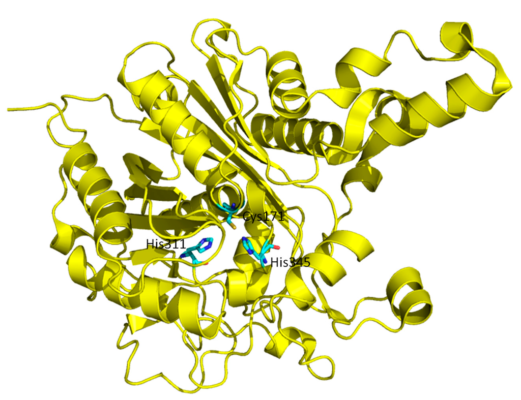 Overall structure of β-Ketoacyl ACP synthase I (KasA). Three residues in the active site, Cys171, His311 and His345, important for catalysis are highlighted in bond representation.
