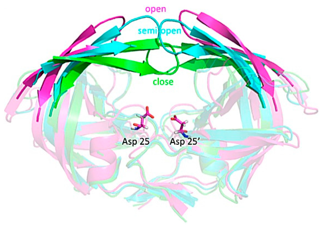 - Hornak, V.; Okur, A.; Rizzo, R.C.; Simmerling, C. HIV-1 protease flaps spontaneously open and reclose in molecular dynamics simulations. Proc. Natl. Acad. Sci. USA 2006, 103, 915–920. [Google Scholar] [CrossRef] [PubMed]