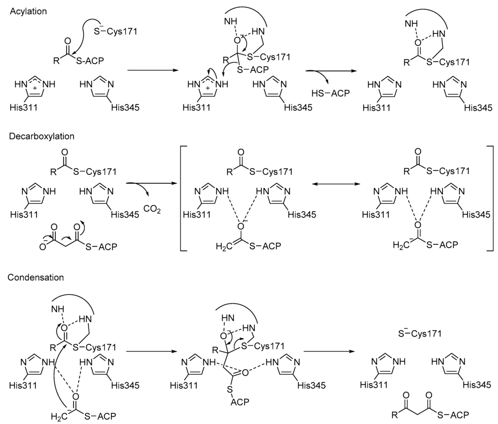 β-Ketoacyl ACP synthase I (KasA) is a key enzyme in the survival of mycobacterium tuberculosis (M. tuberculosis), the causative pathogen of tuberculosis []. It has been proven that KasA is important in the biosynthesis of mycolic acid, which is one of the building blocks of the cell wall in M. tuberculosis. Therefore, KasA is a promising drug target in tuberculosis treatment. The catalytic cycle of enzyme mechanism consists of three steps, acylation, decarboxylation and condensation (Figure 5). First, Cys171 of the active site attacks and binds with acetyl chain delivered by acyl carrier protein (ACP). ACP is subsequently eliminated, and His311 is deprotonated in the acylation step. Decarboxylation of another ACP in the active site generates an enolate, which is stabilized by His311 and His345. The enolate tautomerizes to a carbanion that attacks the carbonyl carbon of acylated Cys171, which finally forms an elongated acyl chain. However, the enzyme mechanism has been debated and discussed [], due to the multiple possible protonation states of its catalytic residues, Cys171, His311 and His 345.