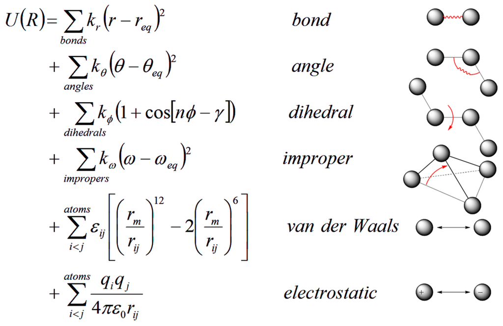 In MD simulations, an initial model of the system is prepared from nuclear magnetic resonance (NMR), crystallographic, or built by homology-modeling when experimental data are not available. Different solvation models, including both explicit and implicit representations, can be used for the simulation [,,,,,,,,]. Once the simulation system is built, forces acting on each atom can be obtained by deriving equations with parameters such as equilibrium bond length or angle, partial atomic charge, and van der Waals atomic radii (called “force-field” [,]) (Figure 6). Forces arising from interactions occur from both bonded and non-bonded atoms. Chemical bonds, atomic angles and improper angles are modeled by harmonic motions, and dihedral angles are modeled by using a sinusoidal function that approximates the energy differences between eclipsed and staggered conformations. Non-bonded forces include van der Waals interactions, modeled using the Lennard–Jones potential, and electrostatic interactions, modeled using Coulomb’s law.