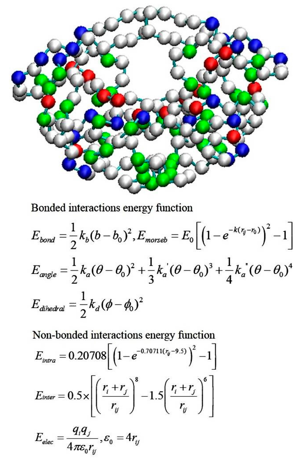 Classical force fields used for MD simulations: (Right) potential energy terms in a force field; and (Left) energy function used to derive atomic forces for molecular movement. r is the bond length; θ is the atomic angle; ϕ is the dihedral angle; ω is the improper dihedral angle; rij is the distance in between atom i and j; kr, kθ, kϕ, and kω are force constants; req, θeq and ωeq are equilibrium positions; the dihedral term is a periodic term characterized by a force constant (kω), multiplicity (n), and phase shift (γ); εij is related to the Lennard–Jones well depth; rm is the distance at which the potential reaches its minimum; qi and qj are the charges on the respective atoms; and ε0 is the dielectric constant.