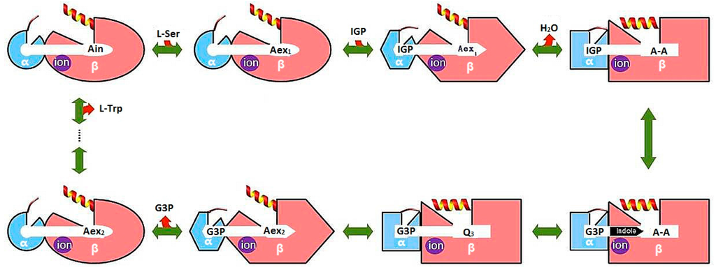 Bacterial TRPS is a bifunctional tetrameric αββα enzyme complex that catalyzes the last two reactions in the biosynthesis of l-tryptophan (l-Trp). In its α-subunit, the enzyme catalyzes the α-reaction, which involves cleavage of indole-3-glycerol phosphate (IGP) to indole and glyceraldehydes-3-phosphate (G3P) []. Indole then diffuses in the channel within the enzyme complex and is condensed with serine at the β active site (β-reaction) (Figure 4). This pathway involves at least nine different intermediates—E(Ain), E(GD1), E(Aex1), E(Q1), E(A-A), E(Q2), E(Q3), E(Aex2), and E(GD2)—formed from PLP and the reacting substrates (Figure 4) [,]. The αβ-reaction involves the following combination: