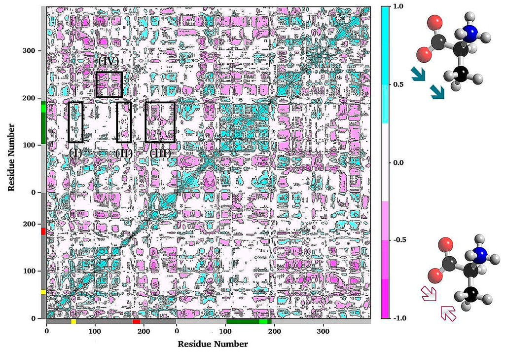 Post-analysis of MD simulations also reveals the most common pattern of protein motion and the dynamic correlations. For example, principal component analysis shows that α-L6 and α-L2 loops and the COMM domain have a strong tendency to move in concert (Figure 1). This synergistic movement is important because α-L6 and α-L2 facilitate the formation of the fully closed conformation to catalyze the α-reaction. In the meantime, the COMM domain receives the signal from allosteric communication to induce the fully closed conformation of the β-site and thereby enhance the overall rate of the α/β-reaction. The correlated motion that supports the experimental suggestions is shown in Figure 8, whereby a bound α-substrate induced a fully closed conformation of α-L6 and α-L2 loop and then further accelerated the COMM domain closure. A detailed cross-correlation matrix can be plotted with programs such as T-Analyst or Bio3D [,], which illustrates residue interactions during MD simulations. Correlations between pairs of residues are presented in cyan (correlated motion) or pink (anti-correlated motion) in Figure 9; correlated motions between α-L6 and α-L2 and the COMM domain are highlighted in squares. The COMM domain and α-L2 loop tend to move to the same direction (region I in Figure 9) and the motion of α-L6 is anti-correlated with that of the COMM domain (regions II and III).
