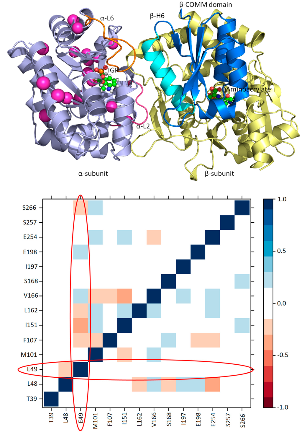 A cluster of residues of the TRPS α-subunit and their cross-correlation map: (Top) residues identified by CHESCA that show correlated motions in the working state are presented as pink spheres; and (Bottom) a cross-correlation map generated from a 100-ns MD simulation for the isolated α-subunit of TRPS from Salmonella typhimurium. The residues are shown in (Top). The program T-Analyst was used to compute the side chain dihedral angles and their correlations with other residues. If a residue has more than one side chain dihedral angle, only the one closest to the protein backbone is used in the analysis. The lower triangle is for the ligand-free (resting) state, and the upper triangle is from the substrate-bound (working) state. The circles indicate the cross-correlations of Glu49 to other residues in the resting and working state, with no significant correlations with the residues in the resting state.