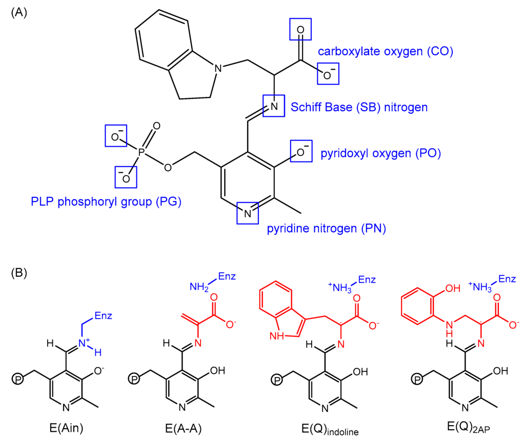 (A) Potential sites of protonation on an indoline quinonoid substrate; and (B) protonation states of four PLP substrates: E(Ain), E(A-A), E(Q)indoline and E(Q)2AP.