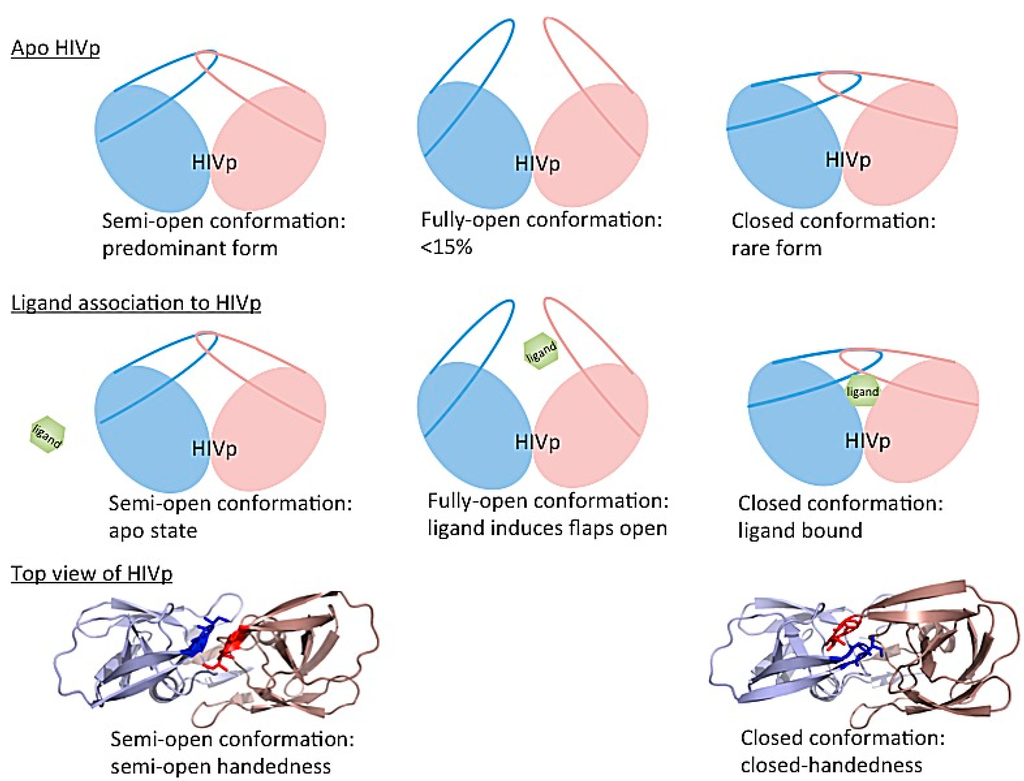 In the apo protein, semi-open conformations, the predominant form of the flaps, still do not open widely enough for substrate association. Although the flaps can open spontaneously, the opening may be induced when a ligand is approaching to the enzyme, which results in an induced flap motion that may accelerate ligand binding [,,]. After substrate/inhibitor binds to HIV-1 protease, the conformations of the flaps will switch from semi-open form with semi-open handedness to closed form with closed handedness (Figure 14 middle). Simulations complement existing observations from experiments and also provide more complete pictures of large-scale enzyme motions and residue rearrangements for ligand binding to help understand binding/catalysis mechanisms and for inhibitor design.