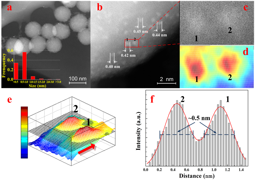 The typical Aberration-corrected high-angle annual dark-filed scanning transmission electron microscopy (AC-HAADF-STEM) image and size distribution: (a) a selected and enlarged region from (a); (b) an enlarged area from (b); (c) a colorized intensity map from (c); (d) 2D Gaussian function fits to the intensity maps (e) and normalized intensity distributions received from the image (e) along arrow direction (f) of the 0.2 Pd/ZrO2 catalyst. The size distribution (inset in (a)) was based on over 400 Pd clusters from the high-magnification images. The two Pd clusters in (b) were designated 1 and 2, respectively.