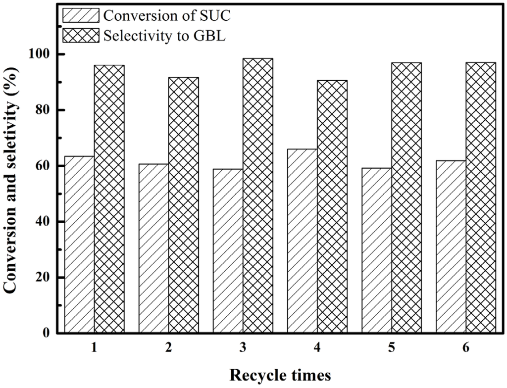 As a promising alternative resource, biomass-derived molecules are widely available and renewable and can be converted into chemicals, medicines and fuels for vehicles. Succinic acid (SUC) as one of the most interesting biomass-derived platform chemicals can be generated via bioprocessing [14,15,16]. The hydrogenation of SUC to produce valuable C4 compounds, including γ-butyrolactone (GBL), tetrahydrofuran (THF) and 1,4-butanediol (BDO), has attracted significant interest for the broad market of the downstream industries [15]. In particular, GBL is a valuable intermediate for producing C4 chemicals, polymers, solvents, pesticides and so forth [17]. Therefore, it is valuable to develop green and efficient processes for converting biomass-derived SUC into GBL.
