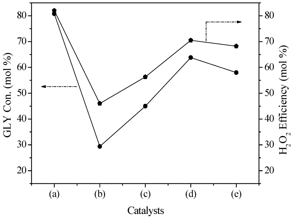 The GLY conversion and H2O2 efficiency over different catalysts: (a) LDH-[Cr(SO3-salphen)], (b) LDH-[Mn(SO3-salphen)], (c) LDH-[Fe(SO3-salphen)], (d) LDH-[Co(SO3-salphen)], (e) LDH-[Cu(SO3-salphen)] Efficiency of H2O2 = (moles of H2O2 converted to the products/moles of H2O2 consumed) × 100.