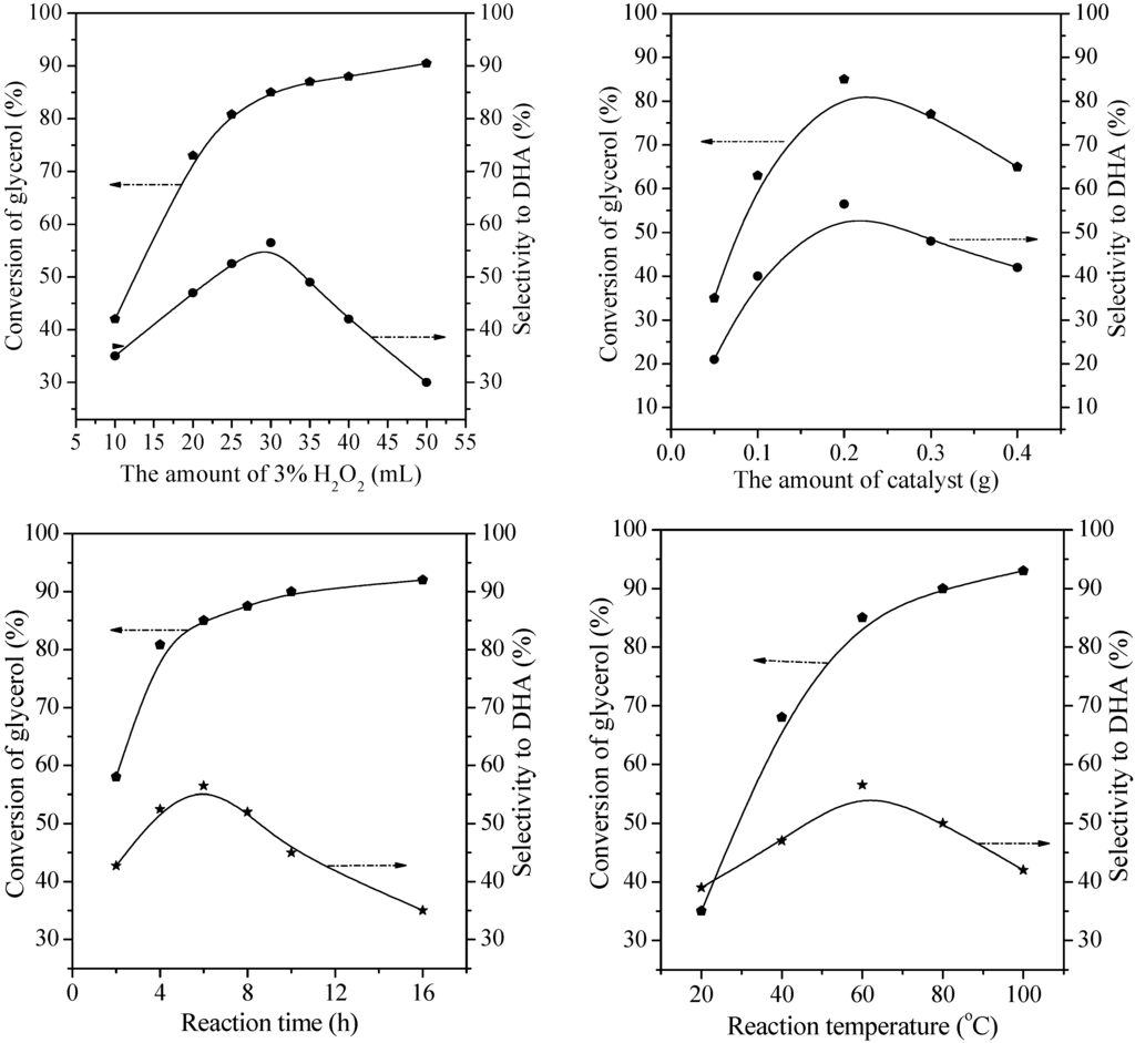 The reaction conditions were further optimized to get the best reaction results with LDH-[Cr(SO3-salphen)] used as the representative catalyst. It was found that the dosage of oxidant and catalyst, the reaction temperature and time all played important roles in the catalytic performance of the obtained LDH-hosted complex catalyst (see Figure 6). With the increase of the reaction time and temperature as well as the oxidant dosage, the glycerol conversion increased continuously, probably because the contact probability of the reactants and oxidant to the active sites of the catalyst increased gradually in the present heterogenized catalytic system. However, excessive time, temperature and oxidant dosage exhibited an adverse effect on DHA selectivity, indicating the presence of over-oxidation. Interestingly, the GLY conversion and DHA selectivity both increased firstly and then decreased with the increase of the catalyst dosage. This indicated that excessive catalyst was unfavorable to the oxidation reaction due to the increased diffusion resistance and the resultant decreased accessibility of reactants to the active centers of the catalyst. Under the optimal reaction conditions (10 mmol GLY, 0.2 g catalyst, 30 mL 3% H2O2, 6 h and 60 °C), the best GLY conversion and DHA selectivity reached 85.0% and 56.5%, respectively. The present reaction results were better than the best results in the bibliography under the solvent and base-free conditions (GLY conversion of 71.3% and DHA selectivity of 43.5% reported by us previously [17]).