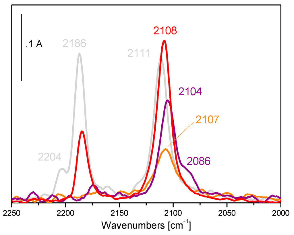 Bands at 2204 and 2186 cm−1, assigned to CO on Ti4+ sites with different coordinative unsaturation [76] were detected on activated Au/TiO2 (grey curve). Moreover, a sharp band at 2111 cm−1, typical of CO adsorbed on Au0 sites exposed at the surface of the nanoparticles, was also detected.