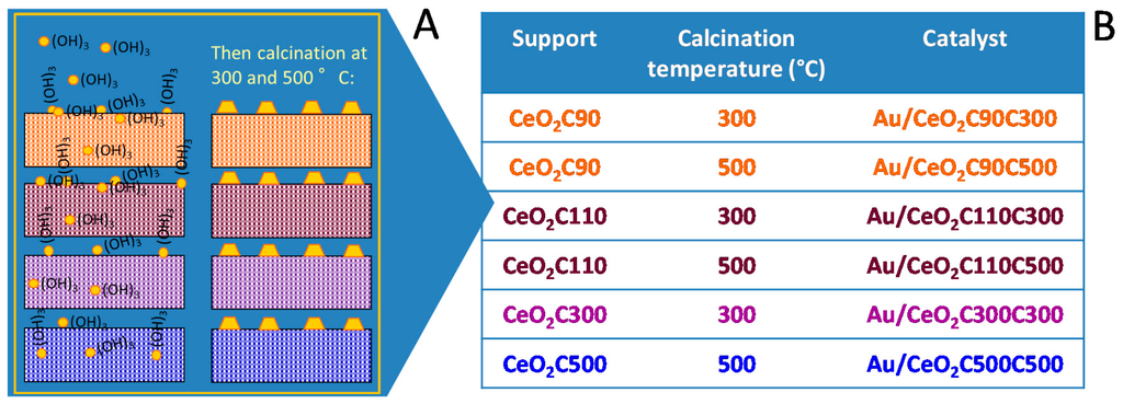 (A) Gold deposition–precipitation on the different CeO2 supports; and (B) list of the obtained catalysts after subsequent calcination at 400 °C and 500 °C.