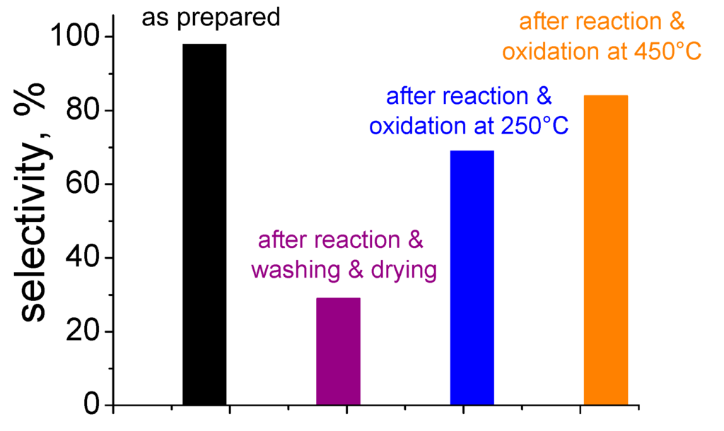 A plausible interpretation of such trend was the presence very small clusters (with size well below 0.7 nm and not noticeable by HRTEM) on the Au/ZrO2 samples calcined at 150 °C and at 300 °C, because of the low temperature of calcination to which the catalysts were submitted during preparation. Previous experimental results related to the epoxidation of propylene and of styrene [66,67], pointed out that there is a limiting size (1.5–2 nm) that differentiates the active catalysts from the inactive ones. Such limiting size seems associated to an intrinsic alteration of the properties of the Au clusters if compared to those related to the nanoparticles. It has been reported that gold clusters, supported on chemically and electronically inert materials, are able to adsorb and activate O2. O adatoms are probably produced and these species can start the partial oxidation reaction [68]. The interplay between the atomic oxygen and the highly dispersed clusters could be more robust than that occurring on the bigger nanoparticles observed on the catalyst submitted to calcination at 500 °C. These findings definitely indicate that the choice of the calcination temperature is crucial to adjust conveniently the gold nanosize.