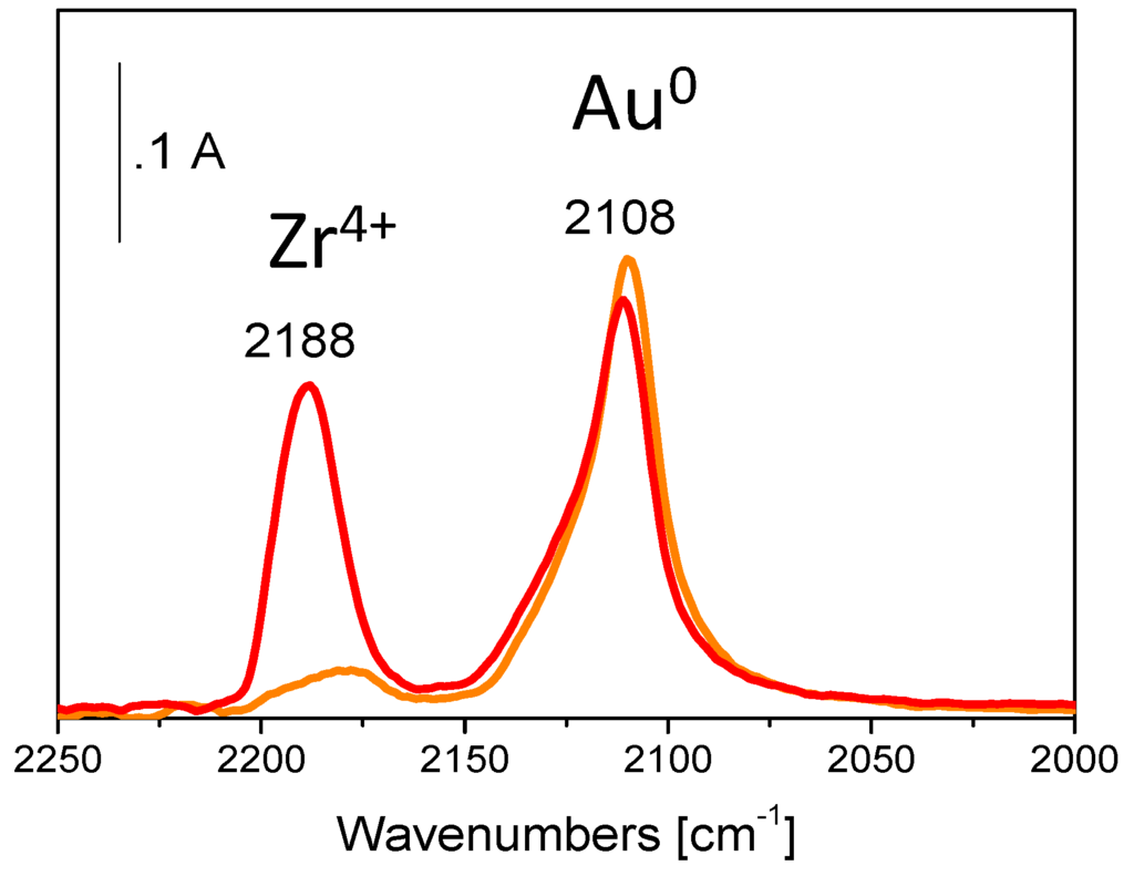 In order to recover supplementary information on the nature of the exposed Au sites present at the surface of the examined samples, CO was used as a probe and FTIR spectroscopy measurements were carried out. An intense and symmetric band at 2100 cm−1, due to CO adsorbed on Au0 uncoordinated sites of gold clusters and small nanoparticles [72], and a weak band a 2163 cm−1, assigned to CO on Zr4+ sites of the support [73] were observed on as prepared Au/ZrO2 calcined at 300 °C upon CO adsorption at room temperature. The same experiment performed on the as prepared sample submitted to calcination at 500 °C gave rise to a band at 2102 cm−1, which appeared with different shape, i.e., asymmetric towards the low frequencies, and whose intensity was lower than that observed in the case of Au/ZrO2 calcined at 300 °C. The component at 2102 cm−1 was assigned to CO on Au0 sites exposed at the surface of nanoparticles [50,74], whereas the component at lower frequency was related to CO on Au0 uncoordinated sites of clusters and of small nanoparticles [72]. The very weak band a 2174 cm−1 was ascribed to CO on Zr4+ sites with different coordinative unsaturation [40,72]. Therefore, the spectroscopic measurements signaled that gold clusters are present not only on the catalyst calcined at 300 °C, but also on that calcined at 500 °C, for which inconclusive HRTEM results were accomplished.