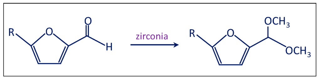 - The third test involved the use of bare zirconia (either plain zirconia or sulfated zirconia), instead of employing the Au/ZrO2 catalyst (Scheme 4). The autoclave was charged as usual and the typical reaction conditions were chosen. Furfural was totally converted (100%); nevertheless, only acetal was produced, possibly due to the Lewis acidity displayed by zirconia [40,41].
