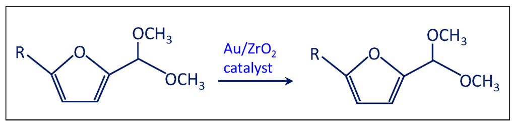 - The solution was filtered and separated from zirconia after the test at point (iii) and performed in the presence of the bare support. Then the solution of acetal in methanol was charged in the autoclave in the presence of the Au/ZrO2 catalyst in order to verify if the acetal molecule can be converted in the furoate over the catalyst under reaction conditions. According to Scheme 5, only acetal was found after the catalytic test. Hence, the results indicate that furfural can be converted into acetal in the presence of the bare support, but acetal, due to its stability, cannot be transformed into the desired furoate.