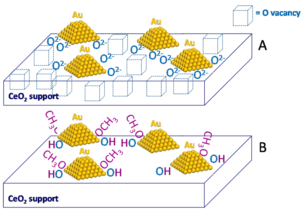 In regard to selectivity, a strong effect displayed by the nanostructure of ceria supports (nanoparticles, rod-like particles and cubic-shaped particles) for gold nanoparticles is observed when α,β-unsaturated aldehydes are employed in the reaction with methanol [43]. In particular, methyl acrylate and 3-methoxy propanal in different ratios were detected in the presence of the different ceria supports and a 100% selectivity to methyl methacrylate for all catalysts was found when methacrolein was used instead of acrolein. The conversion was the highest in the case of gold on ceria nanoparticles and the lowest on the cube-ceria. Finally, the selectivity to methyl 2-butenoate was 100% for Au on ceria nanoparticles and rods, whereas a 100% selectivity to 3-methoxybutanal was observed for Au/ceria cubes in the crotonaldehyde–methanol reaction. The authors ascribed the differences arisen from the structure of the α,β-unsaturated aldehydes to the oxygen activity or reactivity on the surface together with the influence of the methyl group on the reactivity of the aldehyde hydrogen and the inhibition of CH3O-H addition reactions [43].
