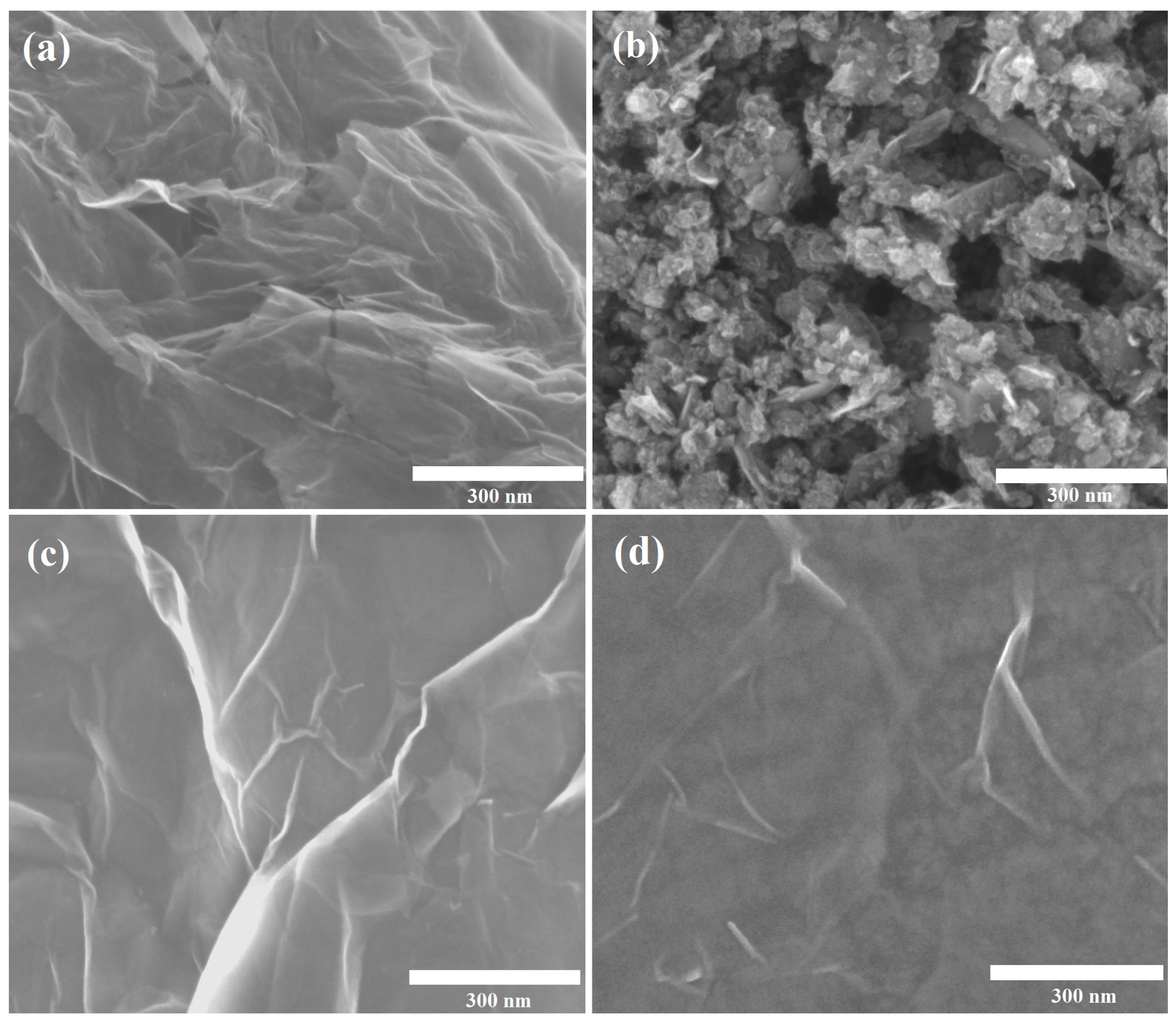SEM (scanning electron microscopy ) images of: (a) graphene nanopowder (from Graphene Supermarket); (b) graphene nanoplatelet aggregates (from Strem Chemicals); (c) graphene oxide; and (d) reduced graphene oxide.