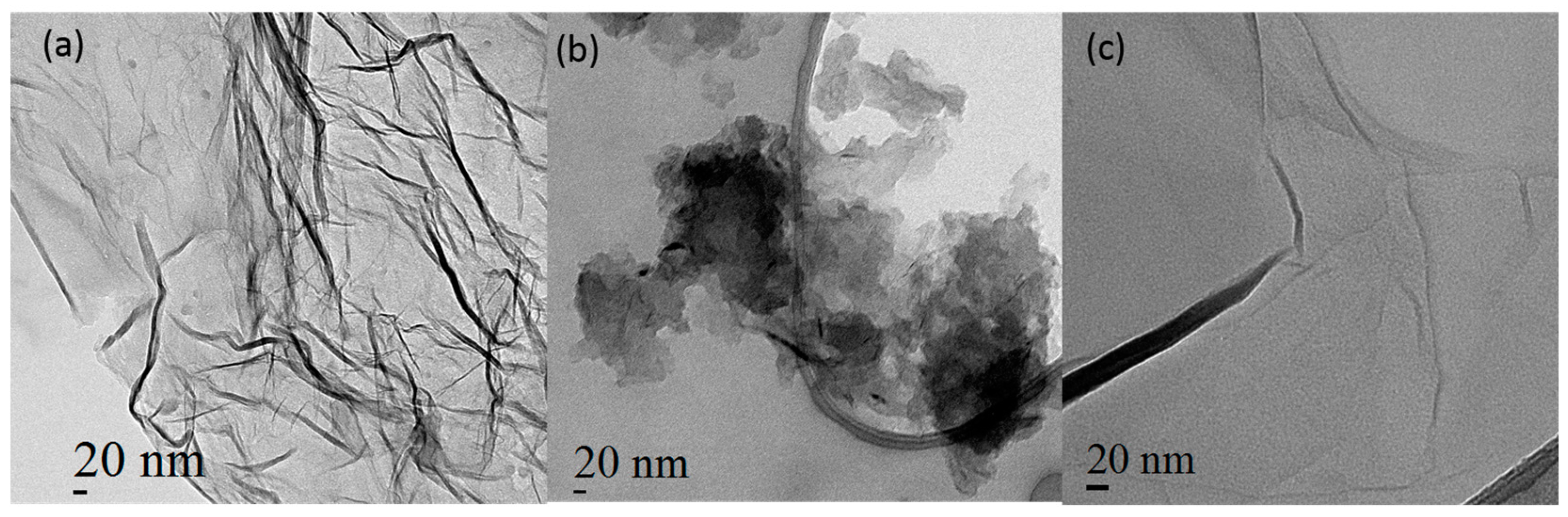 TEM (transmission electron microscopy) images of: (a) graphene nanopowder (from Graphene Supermarket); (b) graphene nanoplatelet aggregates (from Strem Chemicals); and (c) reduced graphene oxide.