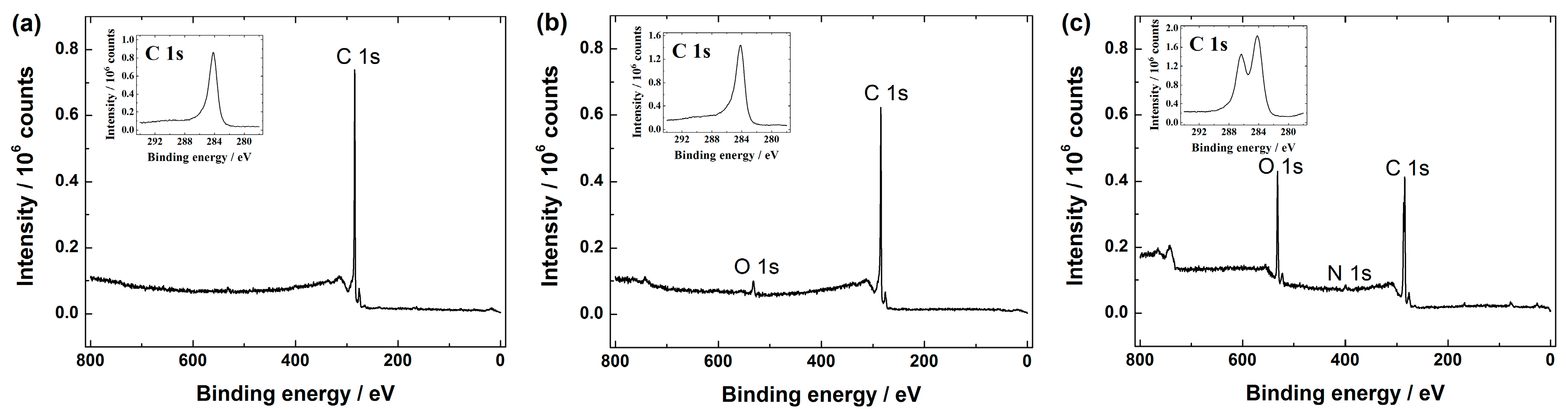 XPS (X-ray photoelectron spectroscopy) survey spectra of: (a) graphene nanopowder (from Graphene Supermarket); (b) graphene nanoplatelet aggregates (from Strem Chemicals); and (c) reduced graphene oxide. The insets show the high resolution XPS spectra in the C 1s region.