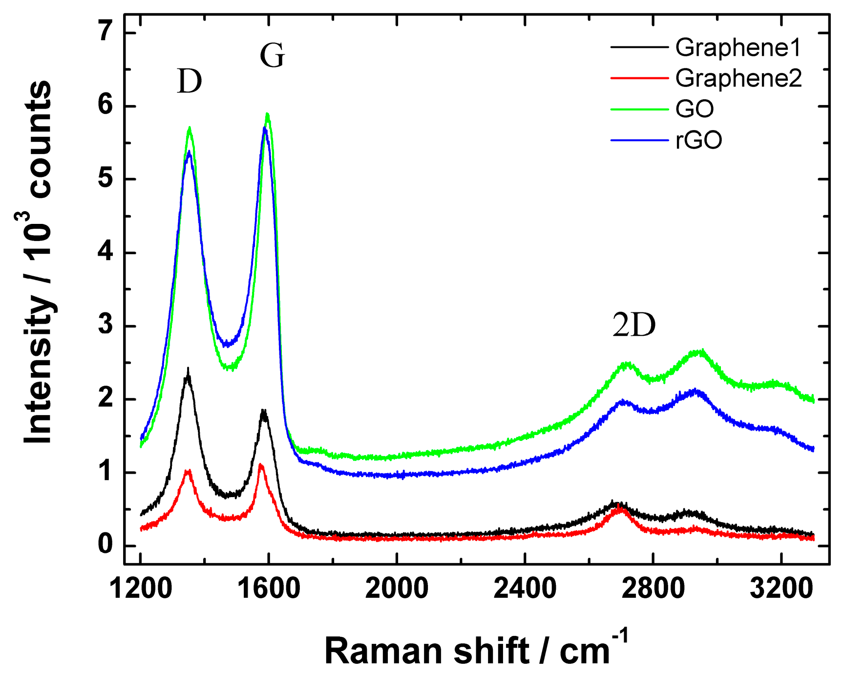 Figure 4 shows Raman spectra of graphene nanopowder (from Graphene Supermarket), graphene nanoplatelet aggregates (from Strem Chemicals), GO and rGO.