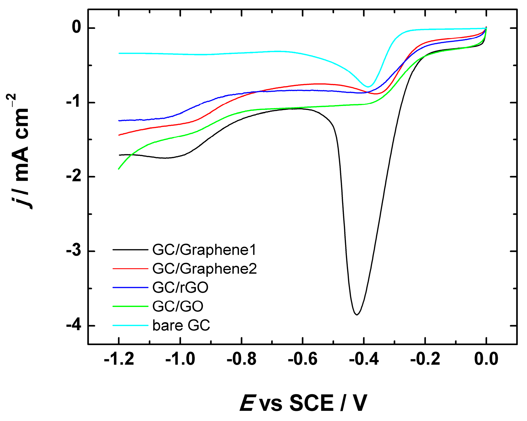 Comparative LSV (linear sweep voltammetry) curves for oxygen reduction on bare GC and GC electrodes coated with graphene nanopowder from Graphene Supermarket (GC/Graphene1), graphene nanoplatelet aggregates from Strem Chemicals (GC/Graphene2), reduced graphene oxide (GC/rGO) and graphene oxide (GC/GO) using suspension in 2-propanol containing OH− ionomer for the electrode preparation. LSVs were registered in O2-saturated 0.1 M KOH at ν = 100 mV·s−1.
