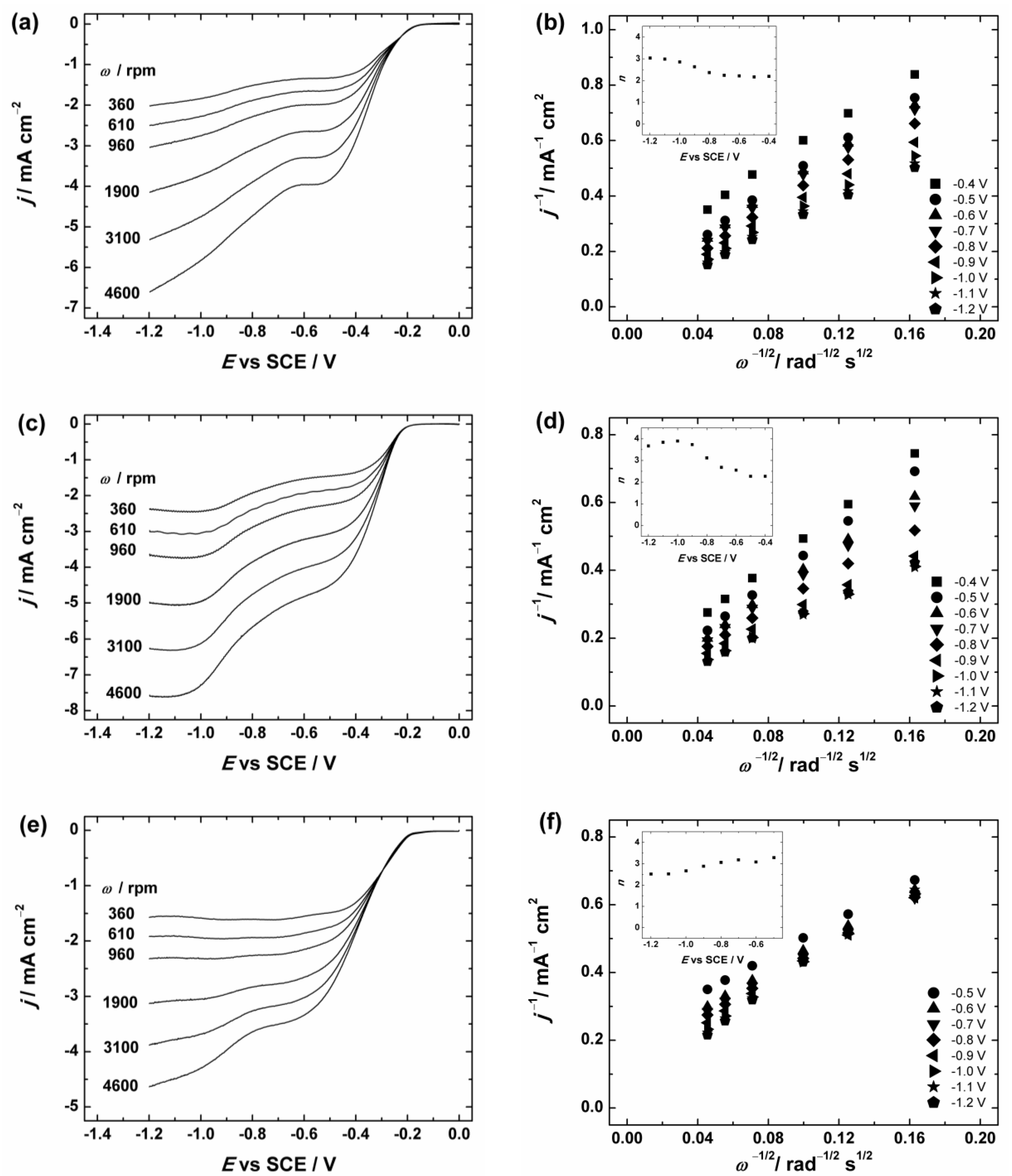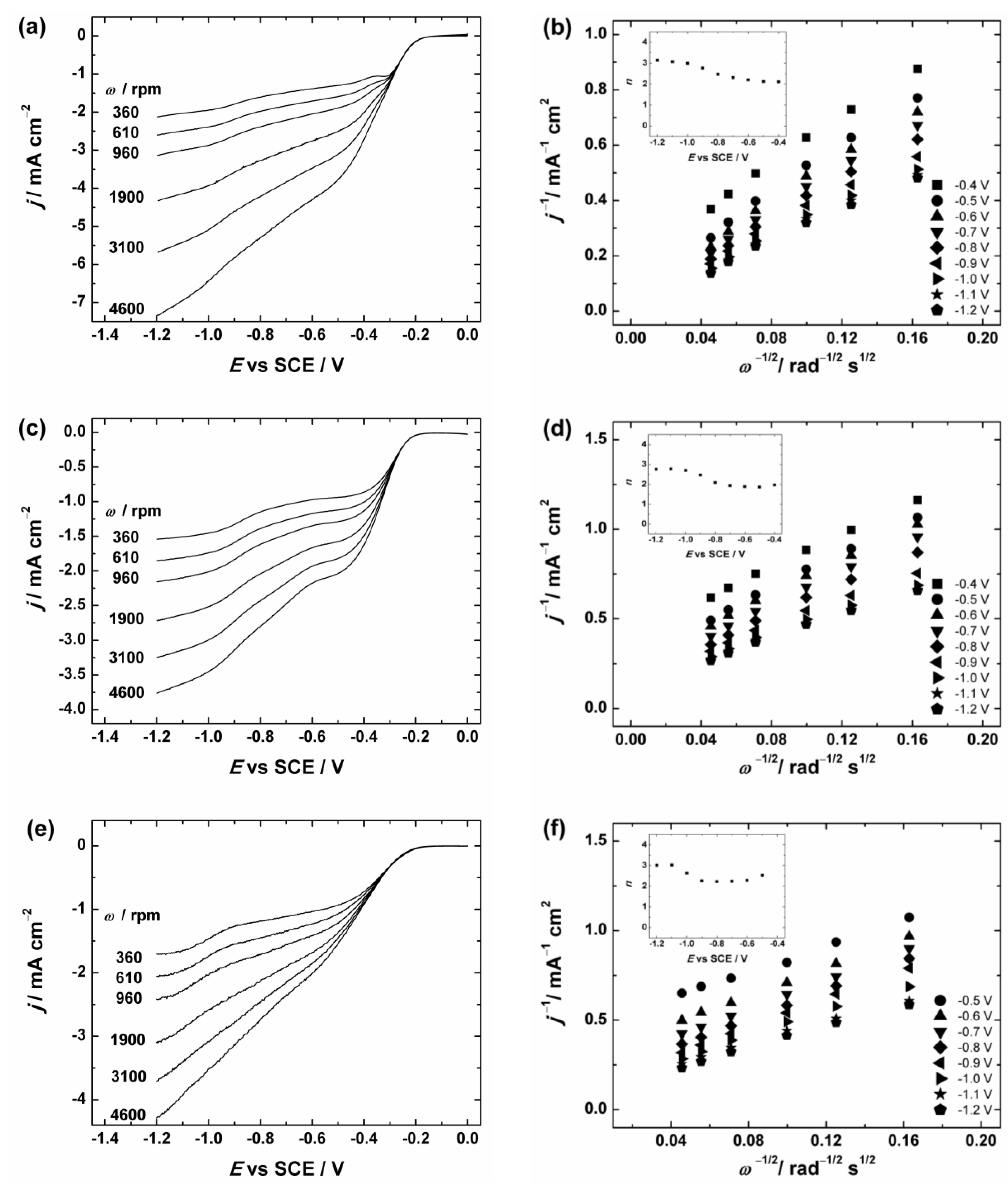 where j is the measured current density, jk and jd are the kinetic- and diffusion-limited current densities, respectively; n is the number of electrons exchanged; F is the Faraday constant (96485 C·mol−1); k is the electrochemical rate constant for ORR; is the concentration of O2 in bulk (1.2 × 10−6 mol·cm−3 in 0.1 M KOH [71]); is the diffusion coefficient of oxygen (1.9 × 10−5 cm2·s−1 in 0.1 M KOH [71]); ν is the kinematic viscosity of the solution (0.01 cm2·s−1 [72]); and ω is the electrode rotation rate (rad·s−1). The K-L plots were analysed in the potential range between −0.4 and −1.2 V vs. SCE from the RDE data presented in Figure 6 and Figure S3. These K-L plots show that the process of O2 reduction is under the mixed kinetic–diffusion control in a large range of potentials (see Figure 6b,d,f and Figure S3b). The value of n was calculated from the slopes of the K-L plots and the dependence of n on the potential is presented in the insets of Figure 6b,d,f and Figure S3b. In Figure 6 the calculated n value for GC/Graphene1, GC/Graphene2, GC/rGO (see Figure 6) and GC/GO electrodes (see Figure S3) gradually increases with decreasing potential. In more specific, the n value is close to two at E > −0.8 V and increases up to three at more negative potentials. This indicates that the ORR process on GO and graphene-based materials at low overpotentials proceeds predominately via two-electron pathway with the production of HO2−.