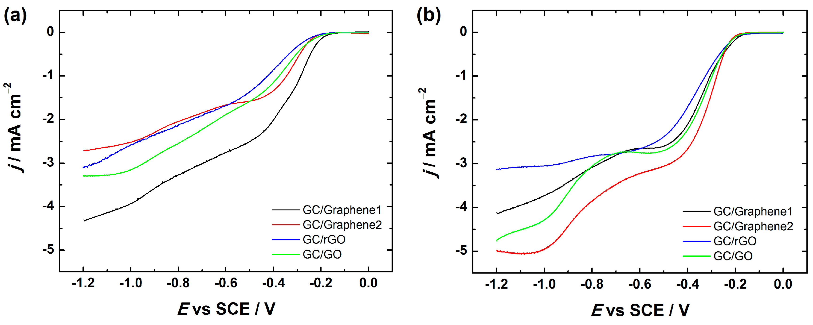 Unfortunately, the reason for this inhibiting effect remains unclear, but it could be considered that the inhibition of the ORR kinetics might be caused by the interaction between the OH− ionomer and GC/Graphene2, GC/rGO and GC/GO surface, which results in some blocking of the catalytic sites of the graphene-based materials that are responsible for the ORR activity.