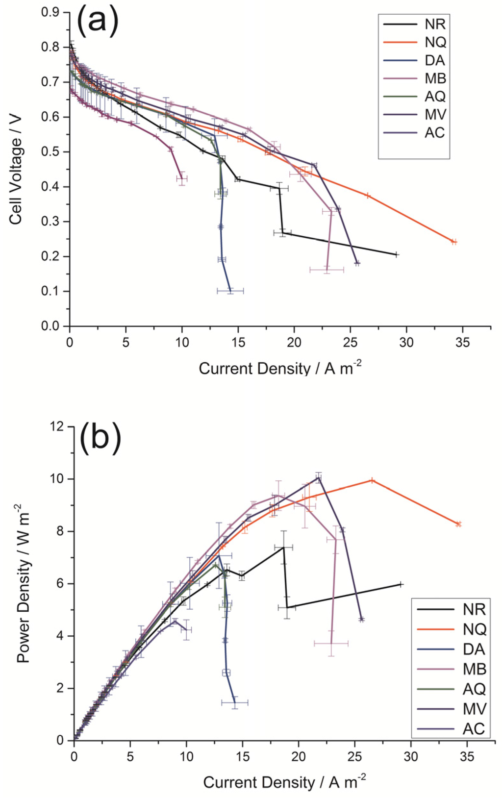 The effect of doping with different electron mediators on the fuel cell performance is presented in Figure 1. Table 1 lists molar mass, molecular structure, molecular formula, soluble in ethanol solution, cell voltage, current density, power density, and market prices of six different electron mediators. The mass ratio of AC and each electron mediator solution is 1:1 on the anode. The cell equipped with MV doped AC (MV-AC) anode exhibits the best performance, with open cell voltage of 0.78 V, peak power density of 10.05 Wm−2, and peak current density of 25.61 Am−2.The cell equipped with NQ doped AC (NQ-AC) anode has comparable performance with the cell equipped with MV-AC anode, with open cell voltage of 0.79 V, peak power density of 9.95 Wm−2, and peak current density of 34.23 Am−2.