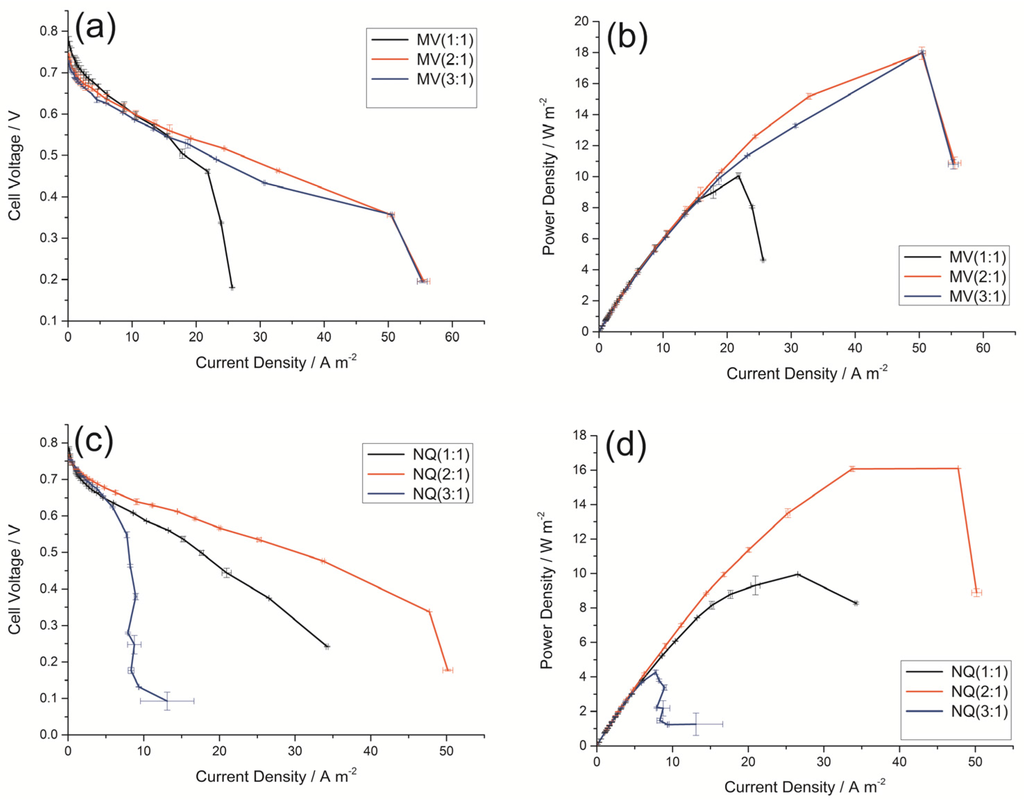 Figure 2a–d shows the cell performance with different MV-AC and NQ-AC anodes, respectively. Peak power densities of 10.05 Wm−2, 17.95 Wm−2, and 18.01 Wm−2 are obtained for DGAFCs equipped with 1:1, 2:1, 3:1 (mass ratio of 30 mM MV solution/AC) anodes, respectively. Peak current densities obtained are 25.61 Am−2, 55.53 Am−2, and 55.30 Am−2 for DGAFCs equipped with 1:1, 2:1, 3:1 MV-AC anodes, respectively. Peak power densities of 9.95 Wm−2, 16.10 Wm−2, and 4.26 Wm−2 are obtained for DGAFCs equipped with 1:1, 2:1, 3:1 (mass ratio of 30 mM NQ solution/AC) anodes, respectively. Peak current densities obtained are 34.23 Am−2, 50.18 Am−2, and 13.10 Am−2 for DGAFCs equipped with 1:1, 2:1, 3:1 NQ-AC anodes, respectively. DGAFCs shows higher performance with anodes doped with higher mass ratio of electron mediators. The explanation is that high concentration of electron mediator can increase the contact sites between the liquid-solid phases, and decrease the internal cell resistance. It is beneficial to capture and deliver more electrons, and accelerate the reaction rate [12]. However, the area of the anode is limited with confined contact sites, and when the concentration of electron mediator surpass the upper limit, electron mediators cannot get charge, thus slowing down the process of electron transfer. In addition, the catalytic effects of electron mediators are restricted by many other factors, including the concentration of glucose and KOH, temperature, etc. [27]. Therefore, there will exist an optimum concentration of electron mediators. This is why the NQ-AC anode has the best performance when NQ vs. AC is 2:1; while the MV-AC anode has the best performance when MV vs. AC is 3:1.