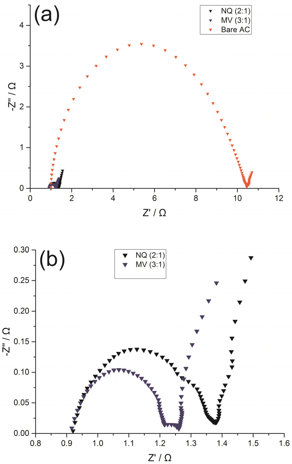 Nyquist plots of EIS by bare AC, NQ/AC (2:1) and MV/AC (3:1) anodes (a); as well as the magnified ones (b).