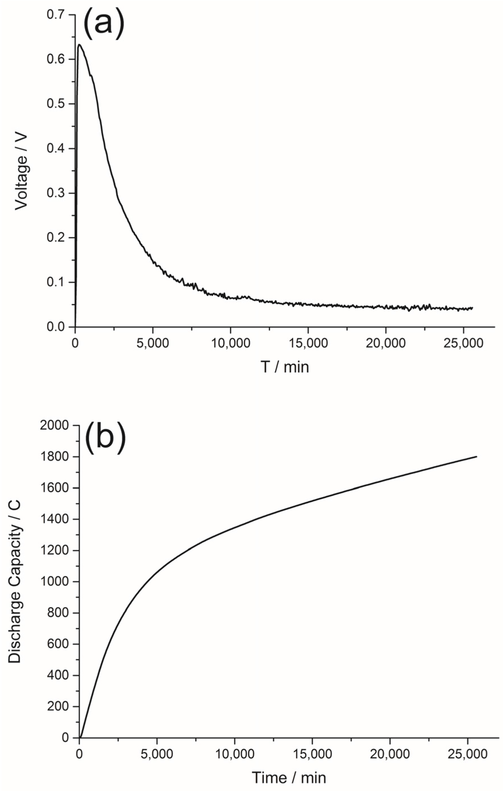 Curves of voltage versus time (a) and discharge curves (b) of the DGAFC under the condition of 1 M glucose, 3 M KOH.