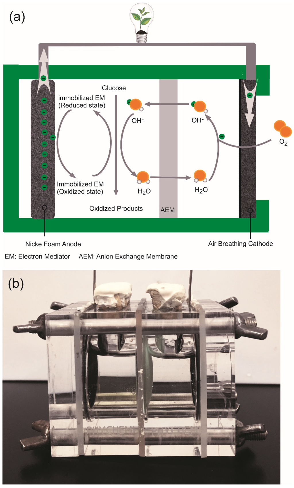 The polymethyl meth acrylate (PMMA) is used to make the two-chamber fuel cell, and the schematic of the structure and photograph of the fuel cell and is shown in Figure 8a,b. For the air breathing cathode, one side was PTFE diffusion layer which was open to air, while another side called the catalyst layer was submerged under the fuel-electrolyte solution entirely. The fuel cell has two 30 mm-diameter cylindrical internal chambers. The anode chamber was filled with glucose and KOH solution, while the cathode chamber was only full of KOH solution. There was an AEM between the two chambers which had selective conductivity of anions to prevent substrate crossover.