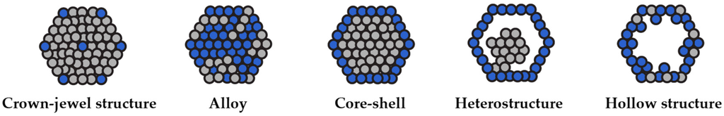 Schematic illustration of bimetallic nanoparticles with different structures.