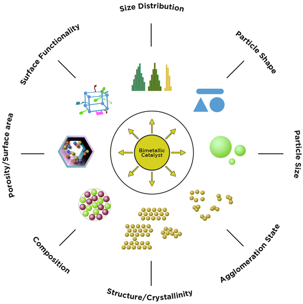 Particle size and shape, structure, composition, surface area and porosity etc. are found to be the main factors that affect the catalytic properties of bimetallic catalysts in different reactions. Figure 2 represents the summary of these factors on the catalytic properties. Additionally, the effects of some other selected factors are also discussed in the following section.
