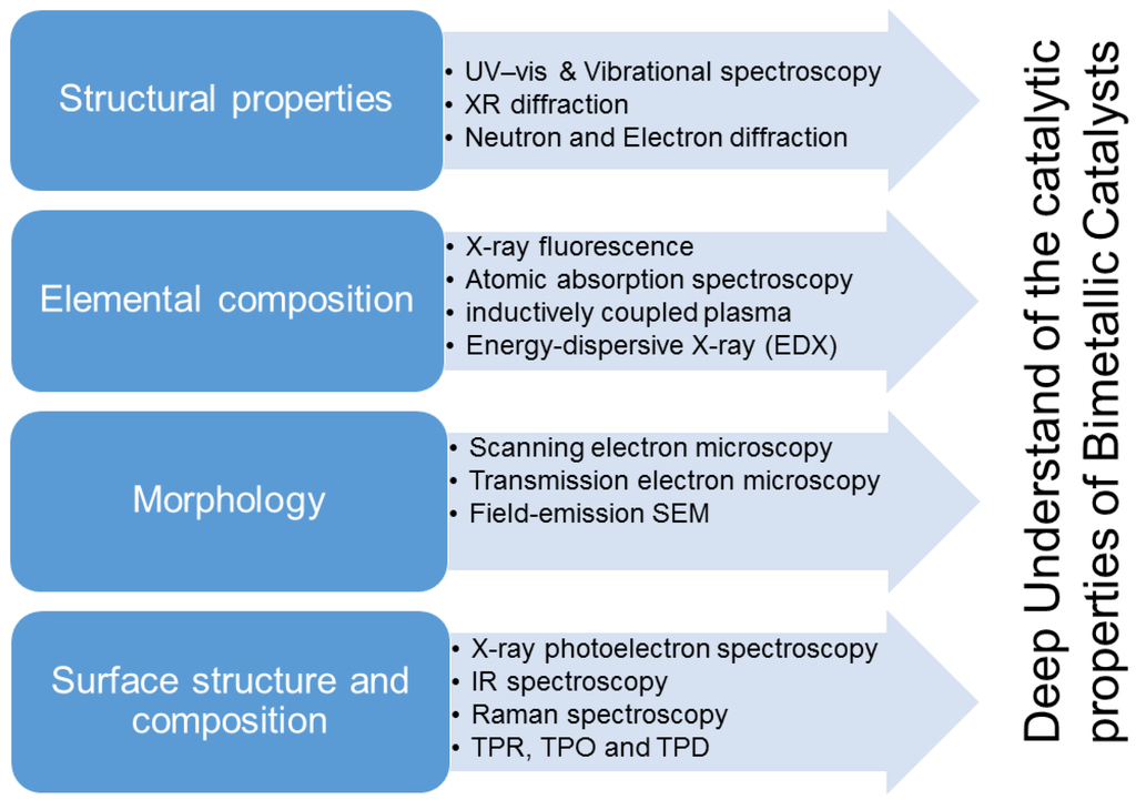A comprehensive knowledge of the chemical and physical properties of bimetallic nanoparticles as heterogeneous catalysts is needed to understand the nature of active sites, which in turn can help to find and tune the key performance indicators. It is essential to understand the catalytic behavior of these materials including deactivation phenomena in such a way that their performance can be further improved. More profound insights on the metal particle structure, size, shape, and catalytic properties of the materials can be gained through a range of methodologies that can be used to categorize them. A range of characterization techniques for identification and characterization of the bimetallic catalysts are illustrated in Figure 3 and the information obtained from these techniques is used for their classification. These techniques can be used either individually or collectively applied in order to understand and analyze the properties of SBN. The data outlining the structural properties can be given by a range of methods such X-ray diffraction, UV-vis (Tokyo, Japan), and vibrational spectroscopy, neutron and electron diffraction methods etc. The list of characterization methods and the information that can be obtained from these techniques are illustrated in Figure 3. X-ray fluorescence (XRF), atomic absorption spectroscopy (AAS), inductively coupled plasma (ICP) (Waltham, MA, USA), and energy-dispersive X-ray (EDX) (Tokyo, Japan) are some of the other methods that can provide the elemental composition. The magnitude and morphology of the bimetallic catalysts can be better understood by utilizing a range of different kinds of microscopy methods (e.g., TEM and SEM) (Tokyo, Japan). The surface structure and composition of bimetallic catalysts can be illustrated using spectroscopic methods (e.g., Raman and X-ray photoelectron (XPS)) (Eden Prairie, MN, USA).
