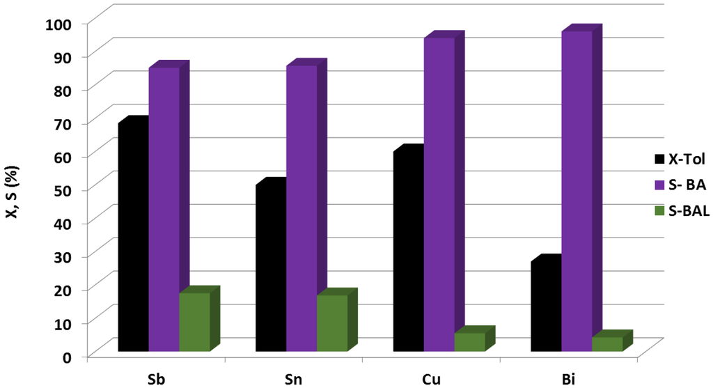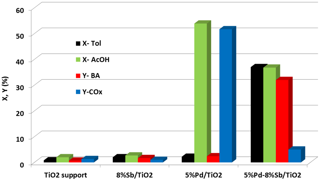 It should be noted that the catalysts used in this study were prepared by a wet impregnation method [76]. It is evident from Figure 4 that the catalytic results obtained on monometallics were inferior compared to bi-metallic Pd-Sb catalysts. It is also obvious that pure TiO2 support is almost inactive, as expected and in a similar manner, monometallic 8% Sb/TiO2 catalyst displayed much lower catalytic activity, i.e., X-Tol ≤ 2%. The most striking feature here is that presence of both Pd and Sb which revealed substantial effect on the catalytic performance. In other words, the combination of Pd and Sb totally improved the direction of reaction in the desired way. Consequently, the yield of COx remarkably reduced from >50% to below 5%. Quite interestingly, the yield of BA significantly enhanced from ca. 2% to >30%. In addition, the conversion of acetic acid (X-AcOH) also reduced from 54% to ca. 35% indicating a considerable decrease in the combustion reaction that leads to the formation of COx. Such enhanced performance of bimetallic Pd-Sb catalyst is undeniably due to existence of synergistic effects between the two metals (i.e., Pd and Sb). These results clearly emphasize the need for the 2nd metallic component to enhance the catalytic performance. After such an amazing effect of the 2nd component, we tried a variety of promoters (instead of Sb), supports, optimisation of Pd and Sb contents etc. Such results are discussed below one after the other in a systematic way.