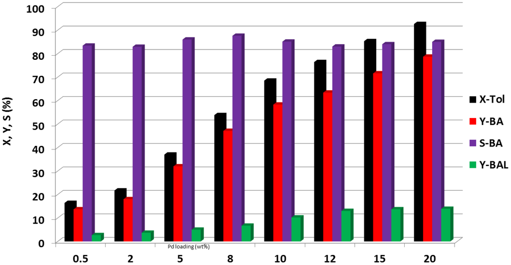 It can be seen that the nature of the promoter has a substantial influence on the catalytic performance. Among the four different promoters investigated, Sb was found to be the best in terms of conversion of toluene. Even though, low conversion of toluene is achieved using Bi as a promoter, it shows another beneficial effect on the long-term stability of the catalyst. Pd-Sb catalysts despite higher activity are used to undergo easy deactivation. On the other hand, Bi and Cu promoted catalysts could solve this problem of deactivation by means of reduced coke deposition and by altering the nature of coke deposition [77,78]. After identifying the higher activity of Pd-Sb/TiO2 catalyst, the optimization of both Pd and Sb contents was further explored in subsequent efforts. For this purpose, two different types of catalysts were prepared by varying the contents of Pd and Sb. In the first series, we kept the Sb loading constant (8 wt %) and changed the Pd loading over a wide range (0.5 to 20 wt %), while in the second series, we kept the Pd content (10 wt %) constant and changed the Sb loading from 4 to 20 wt %. The results of these two series are discussed below. Figure 6 demonstrates that an increase in Pd content has clearly improved the conversion of toluene from 16% to >90% with an increase in Pd content from 0.5 to 20 wt %. However, the conversion of toluene is found to increase at a faster rate up to a Pd loading of 10 wt % and at a slower rate beyond this loading. The BA selectivity is not altered to a considerable extent and remains nearly constant at ca. 85%. In other words, the selectivity of BA is independent of the conversion of toluene. This fact suggests that the product, BA, appears to be a quite stable end product under the reaction conditions applied and hence does not undergo any consecutive reactions to give unwanted by-products. As a result, the BA yield improved considerably and reached a value close to 80%.