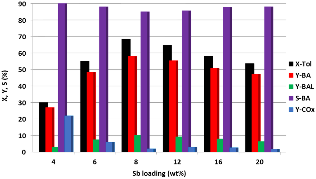 As mentioned earlier, benzaldehyde (BAL) is the major by-product and the balance is total oxidation products. The selectivity to benzaldehyde (S-BAL) varied in the range from 10% to 15%. The higher conversions and greater yields were obtained at higher Pd contents, which might be due to formation of bigger Pd particles (as evidenced from TEM). The peculiar property of this reaction is that bigger Pd particles are more active and selective compared to small Pd particles. Among all, 20 wt % Pd displayed the superior performance. However, due to the expensive nature of 20 wt % Pd, we selected 10 wt % Pd as the model catalyst and used it further in subsequent experiments. Despite achieving an acceptably higher conversion of toluene and high yield of BA, the catalyst samples were observed to suffer from the problem of easy catalyst deactivation. The analysis of coke in the spent (deactivated) samples indicated that the deactivation was due to carbon deposits during the course of the reaction [79]. The amount of coke deposition was observed to increase with increasing Pd load. The highest amount of coke expected, for instance, in the deactivated 20 wt % Pd content catalyst is 7.3%. However, this type of catalyst can be regenerated in air (at 250 °C for 2 h) and can be applied again for more cycles with constant catalytic activity. After identifying the optimum loading of Pd, further efforts were focused on optimizing the Sb content.