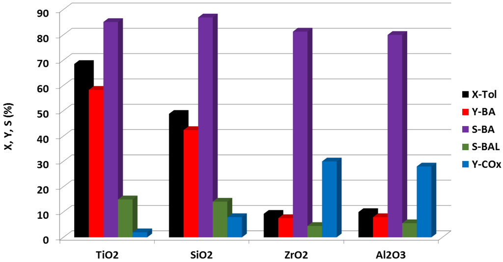 Figure 8 illustrates that the kind of support used revealed a significant effect on both the catalytic activity and/or selectivity of the solids. Among, four different supports investigated, TiO2 anatase support was found to be the best in terms of conversion of toluene and selectivity of BA. However, the lowest activity and the highest COx (ca. 30%) were observed using ZrO2 and Al2O3 as supports (X – Tol = ~10% and Y – BA = ~8%). On the whole, the activity and selectivity behavior of catalysts supported on different metal oxides is related to the size of Pd particles formed in them and the growth mechanism of Pd (e.g., surface reconstruction) during the course of the reaction. One can clearly see big differences in the Pd particle size, particle composition, and coke deposition, which strongly depended upon the nature of support used. About a decade ago, Shu et al. [82] investigated the gas-phase acetoxylation of toluene with acetic acid to benzyl acetate using Pd-Sn-K/SiO2 catalysts and claimed relatively low toluene conversion of 25% with ca. 90% selectivity of benzyl acetate. Additionally, Komatsu et al. [83] also used different Pd-containing bimetallic catalysts for the present acetoxylation of toluene to benzyl acetate.