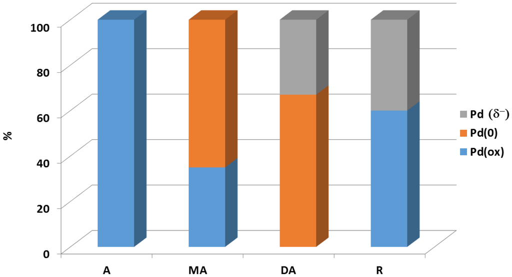 As mentioned above, these catalysts undergo deactivation during time-on-stream (i.e., after several hours of operation). In order to explore the changes occurring at different stages of the reaction and also to identify the reasons for such deactivation, the catalyst subjected to four different stages was collected. The catalyst samples were collected at four different stages such as (i) immediately after activation in air (A); (ii) maximum active one (MA); (iii) deactivated one (DA) and (iv) after regeneration (R). Due to superior performance of 10% Pd-8% Sb/TiO2 solid, this particular catalyst was selected for such a study and characterized by X-ray Photoelectron Spectroscopy (XPS). The results of this XPS study are depicted below in Figure 9 with respect to the proportion of different Pd species existing in the near-surface region. It is quite evident from the figure that the activated sample (i.e., after the activation at 300 °C/2 h/air) contains exclusively (100%) oxidized surface Pd species, as expected. In the catalyst when it reaches maximum activity, the catalyst surface consists of both metallic Pd (65%) and the oxidized Pd species (i.e., 35% PdO species). Quite surprisingly, no such oxidized Pd surface species exists in the deactivated catalyst, instead, it contains both metallic Pd(0) and Pdδ− species. However, the regenerated catalyst, which immediately restored maximum activity, contains a major proportion of oxidized Pd (i.e., PdO) species due to removal of coke during such an oxidative regeneration procedure in air. It is also worth mentioning that even though three different surface species exist in these samples; all the three species were never present together in any one sample at any stage of the reaction. Our results also provide hints that the formation of Pdδ− species with lower binding energy values of Pd electron compared to metallic Pd is the more probable reason for the deactivation of the catalysts [73]. Formation of such a species is expected from the strong interaction between metallic Pd and the carbon species from the coke deposits.