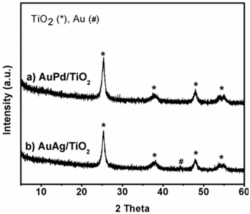 The XRD patterns of the bimetallic catalysts are presented in Figure 1. It is obvious from Figure 10 that there are no reflections belonging to either the Au or the Pd metallic phases. This is due to their low concentrations (1 wt %) and also due to their X-ray amorphous nature, probably. We assume that the particle size of metal nanoparticles appeared to be too small to be identified using XRD. Such results are found to be in good agreement with TEM results where the particle sizes of these metals are small. As shown in Figure 10, we can clearly see the reflections corresponding to TiO2. However, TiO2 supported 1%Au-1%Ag catalyst, exhibited a very weak reflection corresponding to the Au metallic phase besides the typical TiO2 (anatase) reflections.