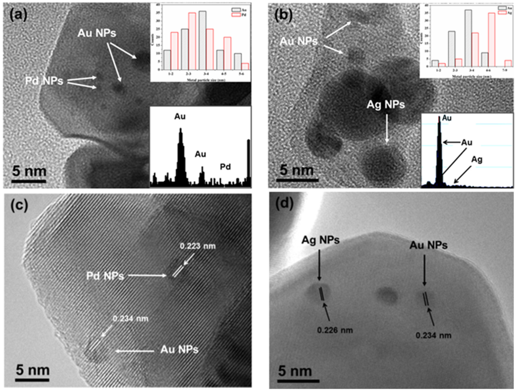 TEM (Transmission electron microscopy) (a: Au-Pd and b: Au-Ag) and HR-TEM (c: Au-Pd and d: Au-Ag) images of Au-Pd and Au-Ag catalysts supported on TiO2 (anatase). EDX (energy-dispersive X-ray) spectra belong to AuPd/TiO2 (inset a) and AuAg/TiO2 (inset b) catalysts. Histograms show particle size of AuPd (inset a) and AuAg (inset b) supported on TiO2 [84].