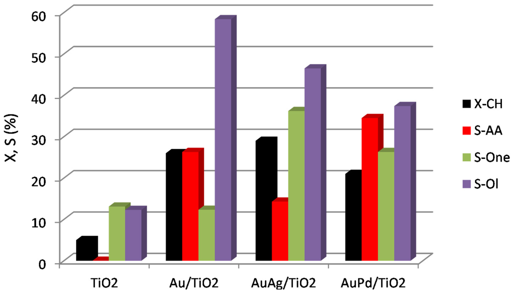 The used bimetallic catalysts were filtered after the first run, and then washed, dried at 120 °C before conducting the second test following the same reaction conditions. Such steps were repeated four times to check the long-term stability of the catalysts. As shown in Figure 13, the conversion of CH and the selectivity of products after the first run over AuPd/TiO2 catalyst decreased slightly. However, this catalyst displayed somehow good stability up to three runs. The selectivity to Ol also decreased from the first run to the second run and then remained more or less constant. On the other hand, a considerable decrease in the conversion of CH and the selectivity of products after four runs was observed in the case of using AuAg/TiO2 catalyst. We can conclude from these results that AuPd/TiO2 is more stable compared to AuAg/TiO2 catalyst. The reasons behind such decrease in the catalytic activity after four cycles could be either due to the leaching of metal components or deactivation by coke or due to marginal loss of catalyst weight during the work-up process of recovery of the catalyst [84].