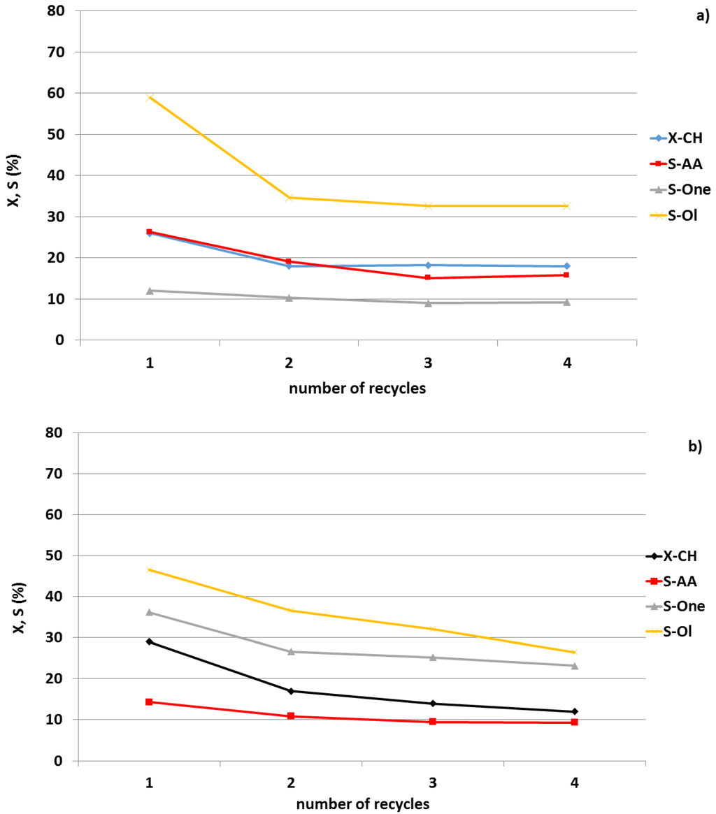 Recycling results of AuPd/TiO2 (a) and AuAg/TiO2 (b) catalysts for the oxidation reaction of cyclohexane (X—conversion, S—selectivity, CH—cyclohexane, AA—adipic acid, One—cyclohexanone, Ol—cyclohexanol; reaction conditions as in Figure 12).