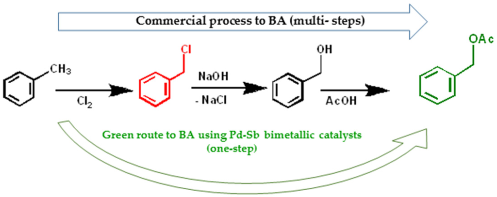 The first studies of our investigations were dedicated to Pd based catalysts and checked their potentiality towards acetoxylation of toluene. Scheme 1 compares the commercial route for producing BA, involving the multi-step process with that of our one-step approach. In addition, the commercial process also involves chlorine chemistry and hence is environmentally unfriendly. On the other hand, the present acetoxylation is a simple and single step process besides its eco-friendly nature. The desired product is benzyl acetate while other by-products such as benzaldehyde (BAL), COx and H2O are also formed in smaller proportions. In addition, this direction also gives the chance of making benzyl alcohol (BOL) by simple hydrolysis of BA. BOL has a huge market compared to BA. On the other hand, it is very difficult to produce BOL from toluene directly in one-step.